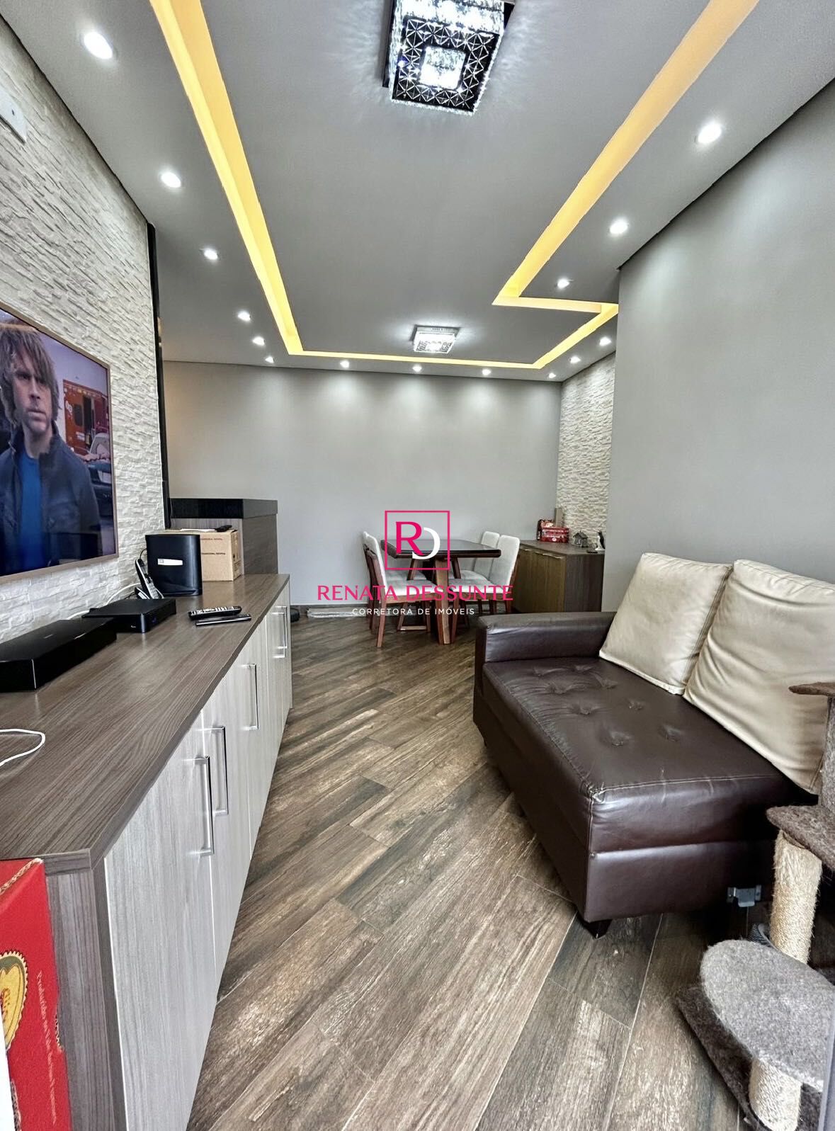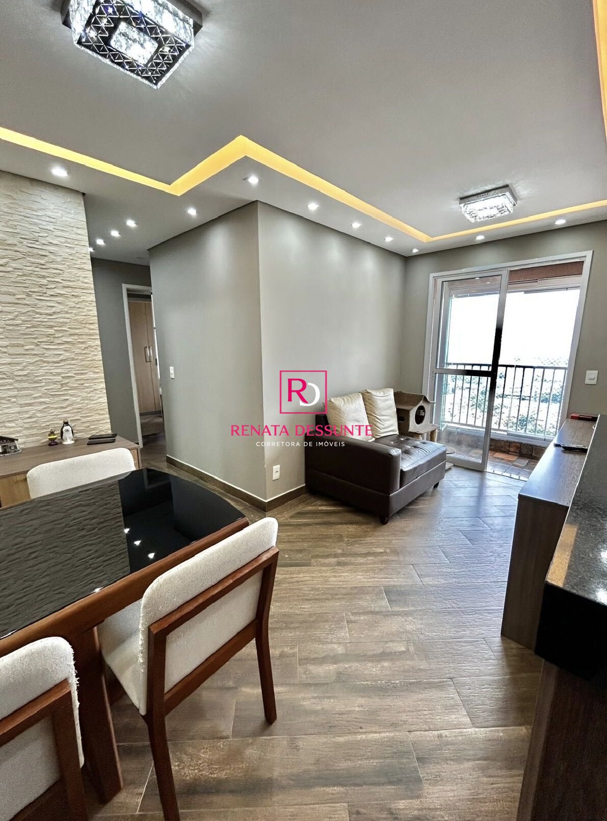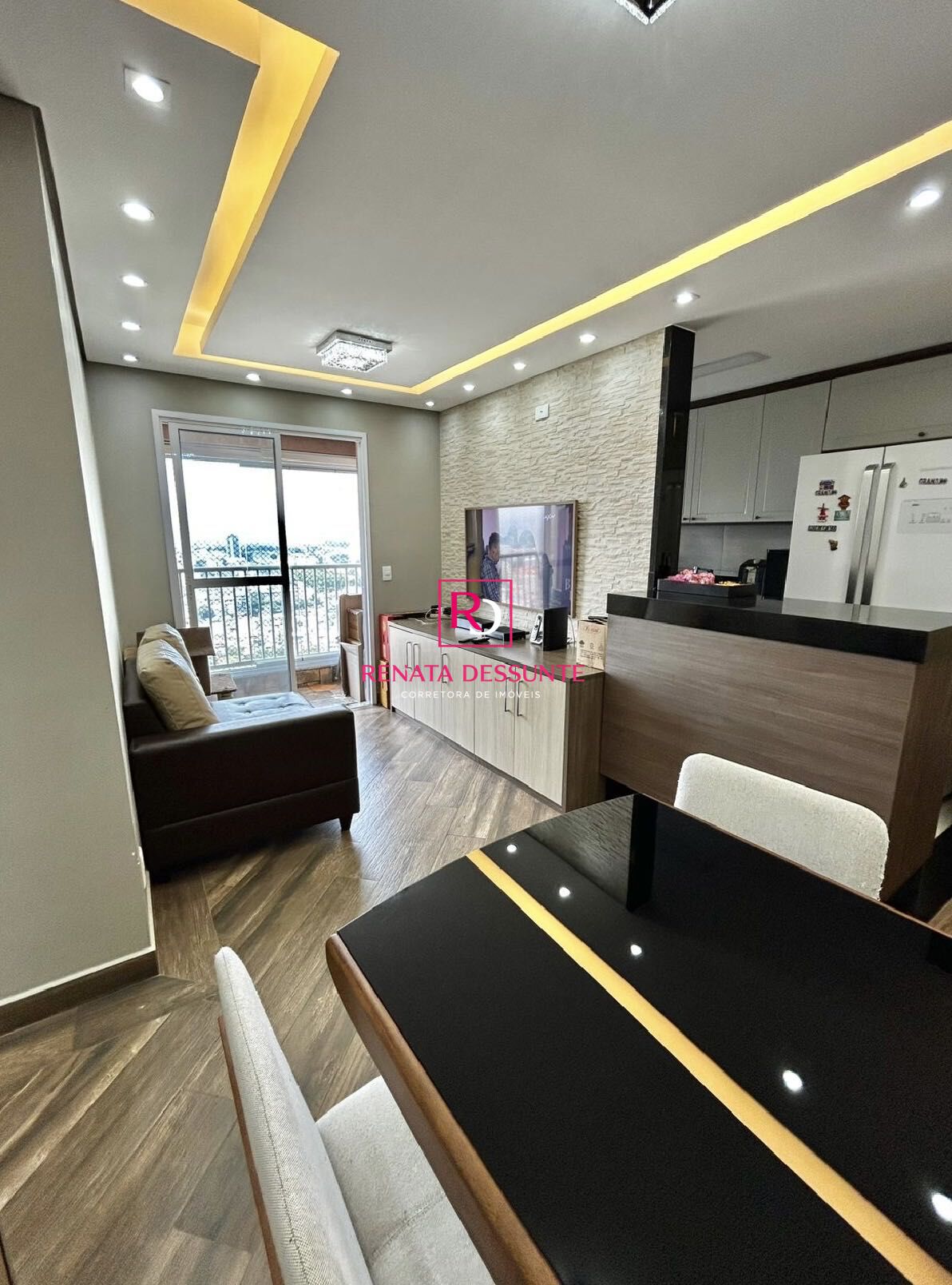 São 2 dormitórios com armários planejados, sendo 1 suíte, Sala para dois ambientes com sacada envidraçada , Cozinha com armários planejados, fogão, forno, coifa e micro-ondas, Área de serviços, Wc social e 3 Vagas de Garagem Cobertas e Fixas.